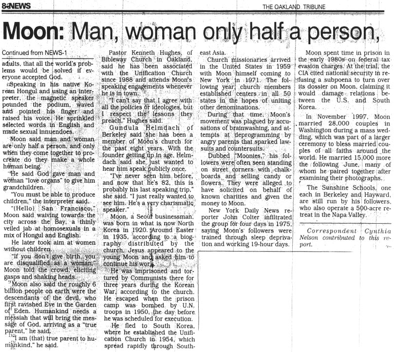 The Oakland Tribune Tuesday, March 13, 2001 Rev. Moon stirs up his fans in Oakland By Mike Martinez STAFF WRITER